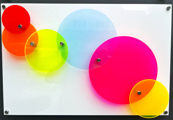Artwork is 16" tall 23" wide and 2" deep. Artwork comes fully assembled with four stainless steel wall mount standoff studs.
